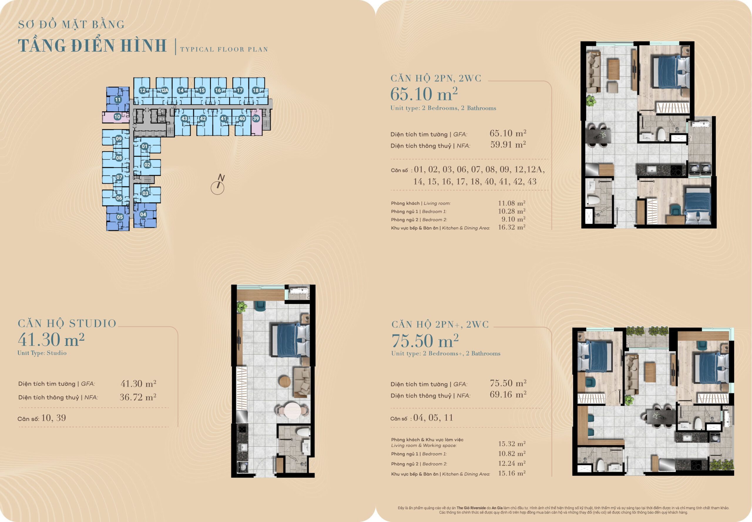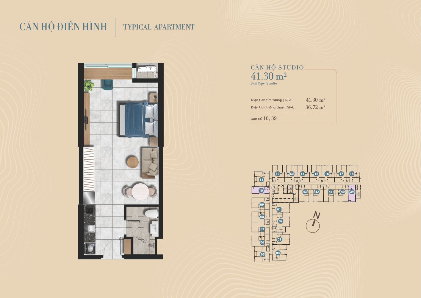 - Studio (41.3m²) – Gọn gàng, tiện nghi cho người trẻ.